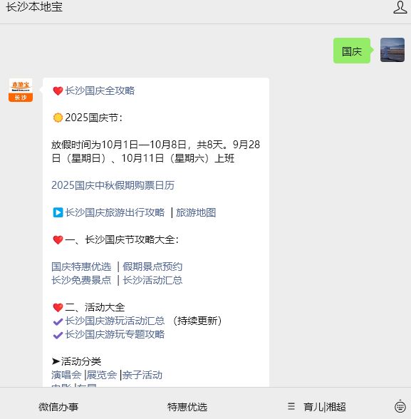 温馨提示:微信搜索公众号【长沙本地宝】,关注后对话框回复【国庆】可获2025年国庆节长沙活动大全、景点免费/优惠、国庆放假调休安排、高速免费时间、国庆烟花活动、国庆演唱会、市区及周边出游路线,火车预售时间等信息等国庆攻略。